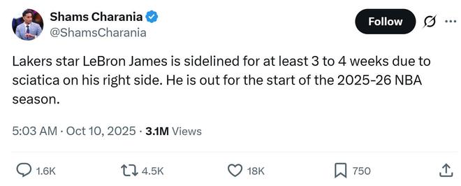 在季前赛火热进行之际,ESPN名记Shams曝出湖人锋线核心詹姆斯遭遇右侧坐骨神经痛,不仅将缺席新赛季揭幕战,更是至少将在新赛季初期缺阵3-4周时间。